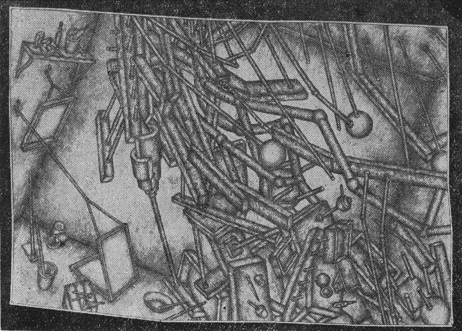 わたしは、自分ではまったく意識していなかったのであるが、このたび河原温の「物置小屋の出来事」や石井義雄の「無人地帯」を見たあとで、なんとなくわたし自身の「建築的なもの」を見ていて意外なことに気がついた。というのは、この三者の作品に、形態感覚や空間構造にどこか共通するものがあるように見えてきたからである。それはあたも連続した一連の流れのなかで制作されたかのようにさえ感じられたのだ。河原温の「物置小屋の出来事」と石井義雄の「無人地帯」は一九五五年の作で、わたしの「建築的なもの」シリーズは一九七〇年代に描かれている。わたしが彼らの作品に関心をもって見たのは二十年も前である。時代背景や美術界の状況もすでにまったく変っている。さらに、わたしがこれを描いた当時の心境は、そのような美術界の状況などもすべて排除して、自分の内なる混沌のなかから手探りで何かの形を掴み出し、また空間を切り開こうとして制作したのであった。にもかかわらず、今あらためて「建築的なもの」を見ると、さらに河原温の「物置小屋の出来事」や石井義雄の「無人世界」を並べて眺めて見ると、もちろんそれぞれの絵画世界は異なるが、形態感覚や空間構造において、まるで連続した一つの流れの延長線上にあるように見えるのが不思議である。すでにふれたが「建築的なもの」を描いたのは一九七〇年代である。その間に二十年の歳月がながれている。にもかかわらず、わたしの無意識の層には、彼らの作品が根強く生き残っていたのだろうか。