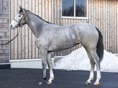 | クラブ募集時の馬体写真 芦毛でかわいい子と評判でした。イイ感じに育っています! |